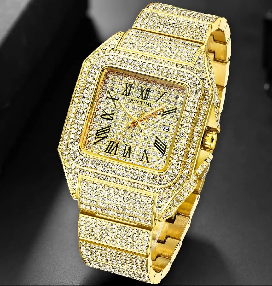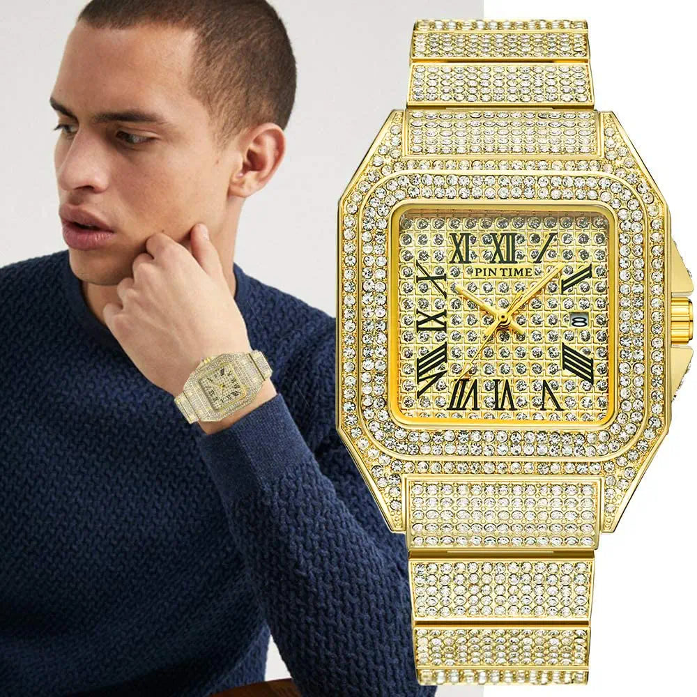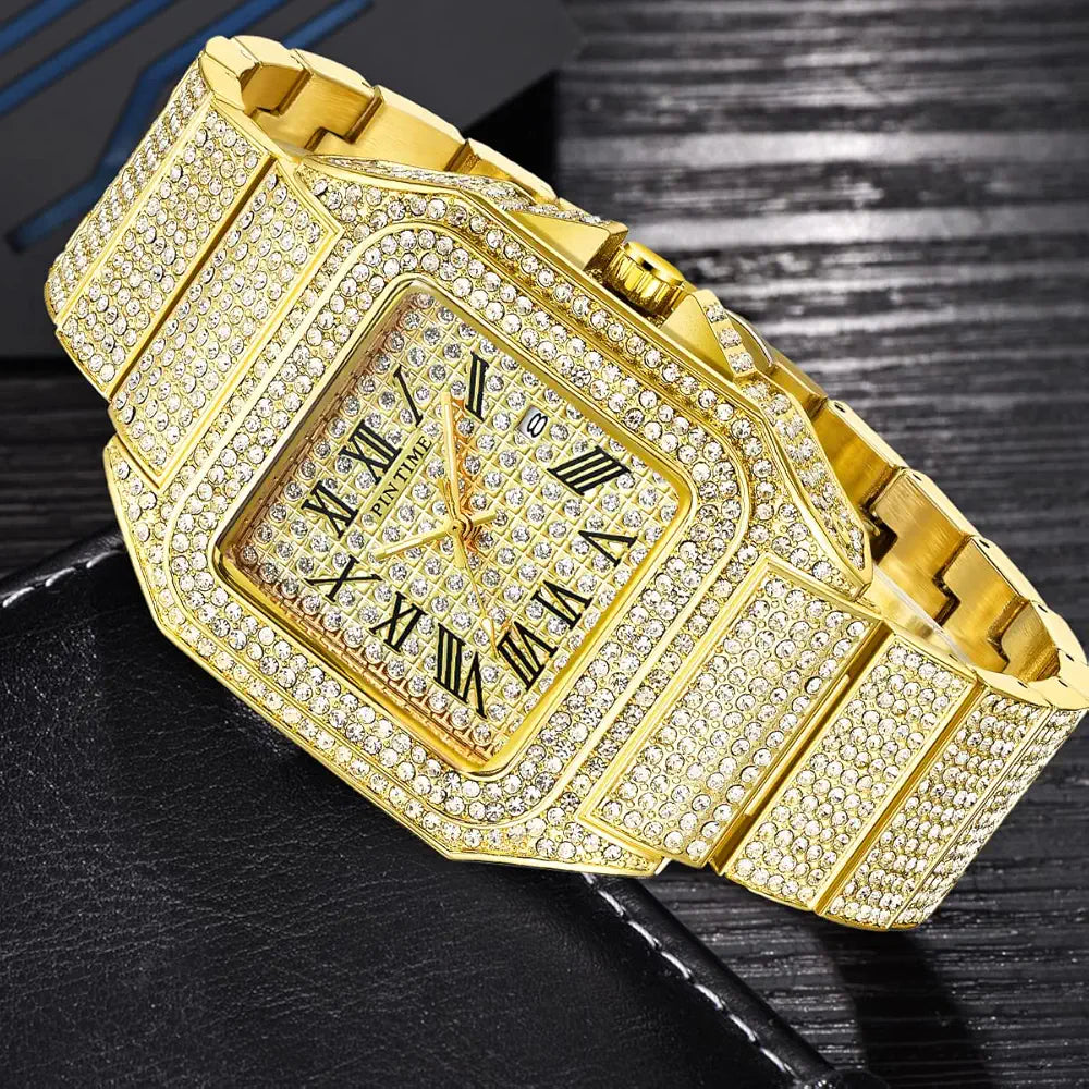Cartier Diamond Square Quartz Watch in Golden - Iced-Out Luxury Timepiece with Roman Numerals