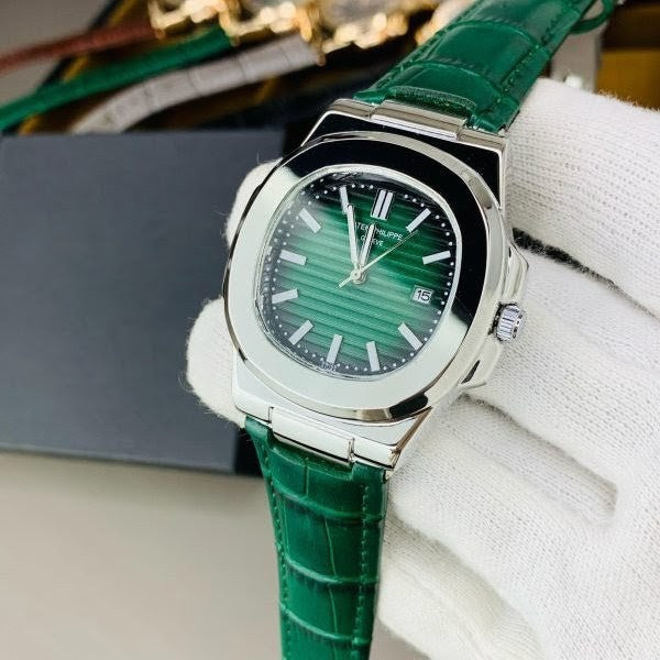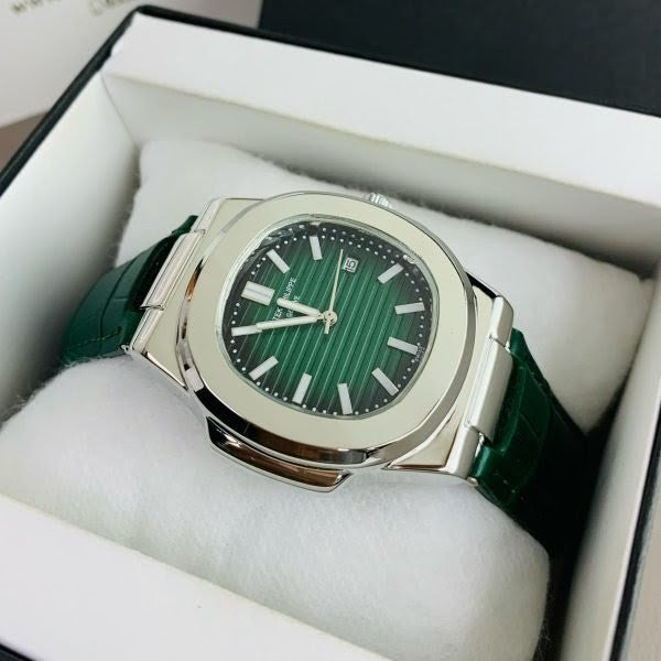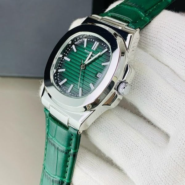 Elevate your style with the Patek Philippe Nautilus Replica - Green Leather Strap & Green Dial Silver Case, a sophisticated nod to Swiss luxury watchmaking. This 40mm men's watch features a vibrant green sunburst dial with luminous hands and a date window at 3 o'clock, housed in a polished silver stainless steel case. Paired with a premium green leather strap and a secure deployment clasp, it’s powered by a precise automatic movement, with a scratch-resistant sapphire crystal face and 100m water resistance, ideal for any occasion.