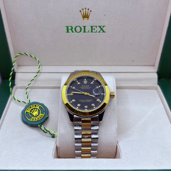 Elevate your wrist game with the Rolex Datejust Two-Tone Black Dial with Diamond Markers, a captivating blend of classic elegance and modern flair from Rolex's timeless collection. As the world's first self-winding waterproof chronometer wristwatch with a date window at 3 o'clock, this luxurious piece features a vibrant green sunray dial adorned with sparkling diamond hour markers for a touch of opulent shine. The two-tone Oyster bracelet in stainless steel and yellow gold provides a sophisticated contrast, while the fluted bezel in yellow gold adds Rolex's signature refinement. Powered by the precise it includes a Cyclops lens for magnified date readability and exceptional legibility thanks to luminous hands. Housed in the iconic Oyster case with 30 meters of water resistance and scratch-resistant sapphire crystal, this watch is built for enduring style and performance—perfect for the discerning collector seeking versatility from boardrooms to evenings out, with proven investment appeal.